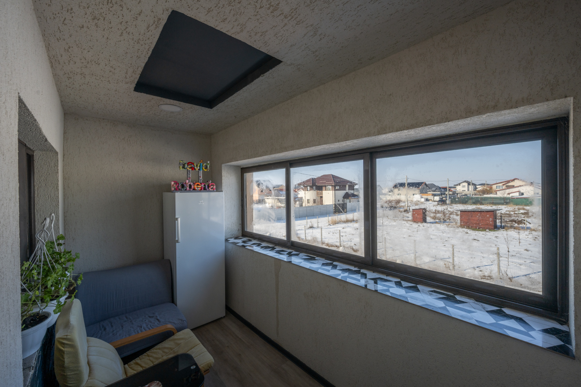 Interior luminos, bucătărie închisă, living mare, spații de depozitare.